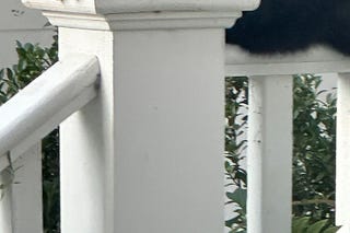 A black cat perches on the white porch railing, still as a carved figure, commanding the whole of his small kingdom.