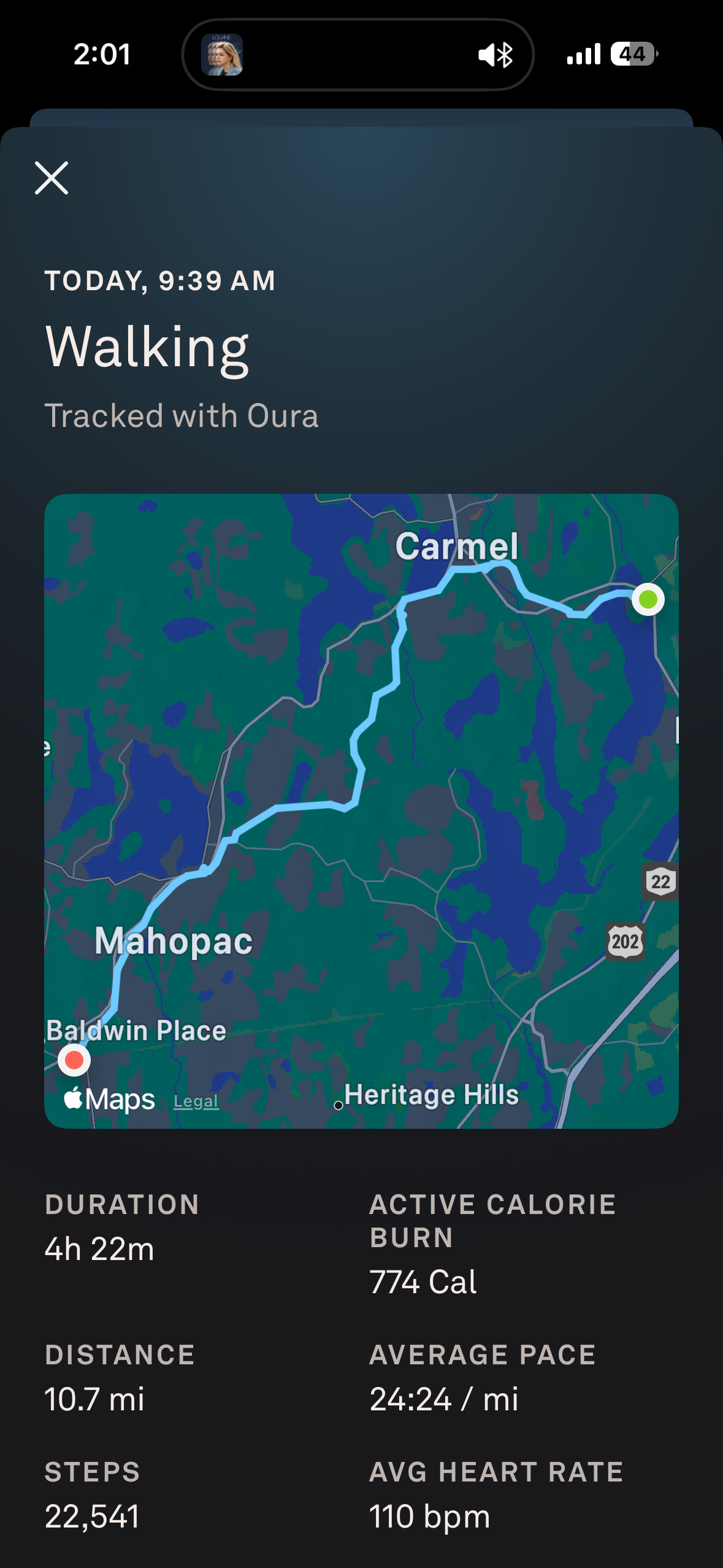 10.7 miles. 4 hours 22 minutes. 22,541 steps.