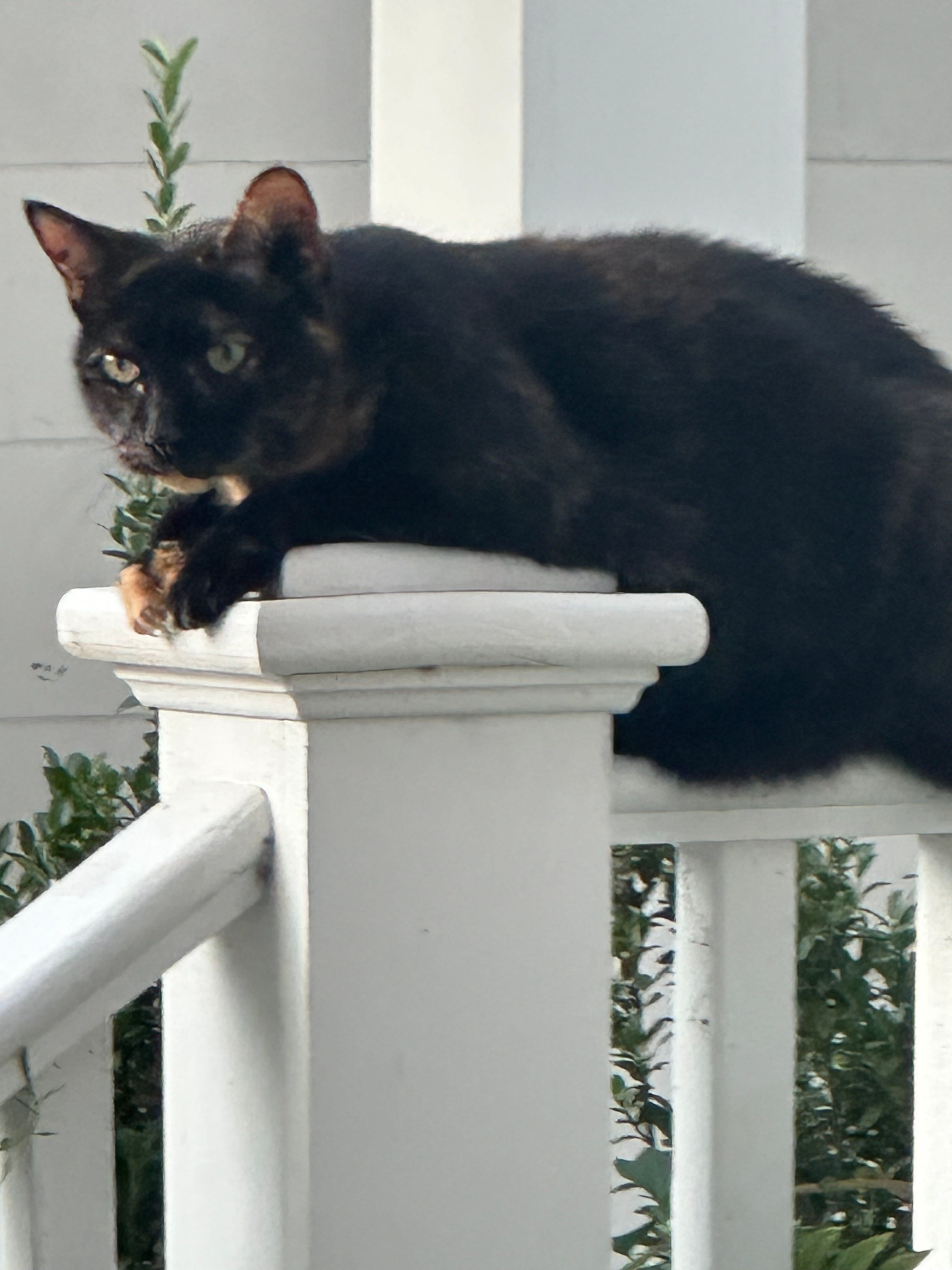 A black cat perches on the white porch railing, still as a carved figure, commanding the whole of his small kingdom. The boxwood rises beside him like a green attendant, and he regards the street with those pale, ancient eyes — not suspicious, never cold, but deeply, unhurriedly present.