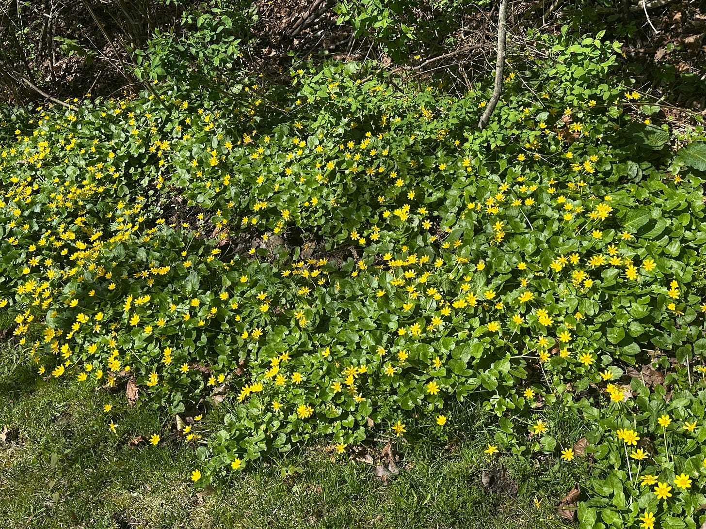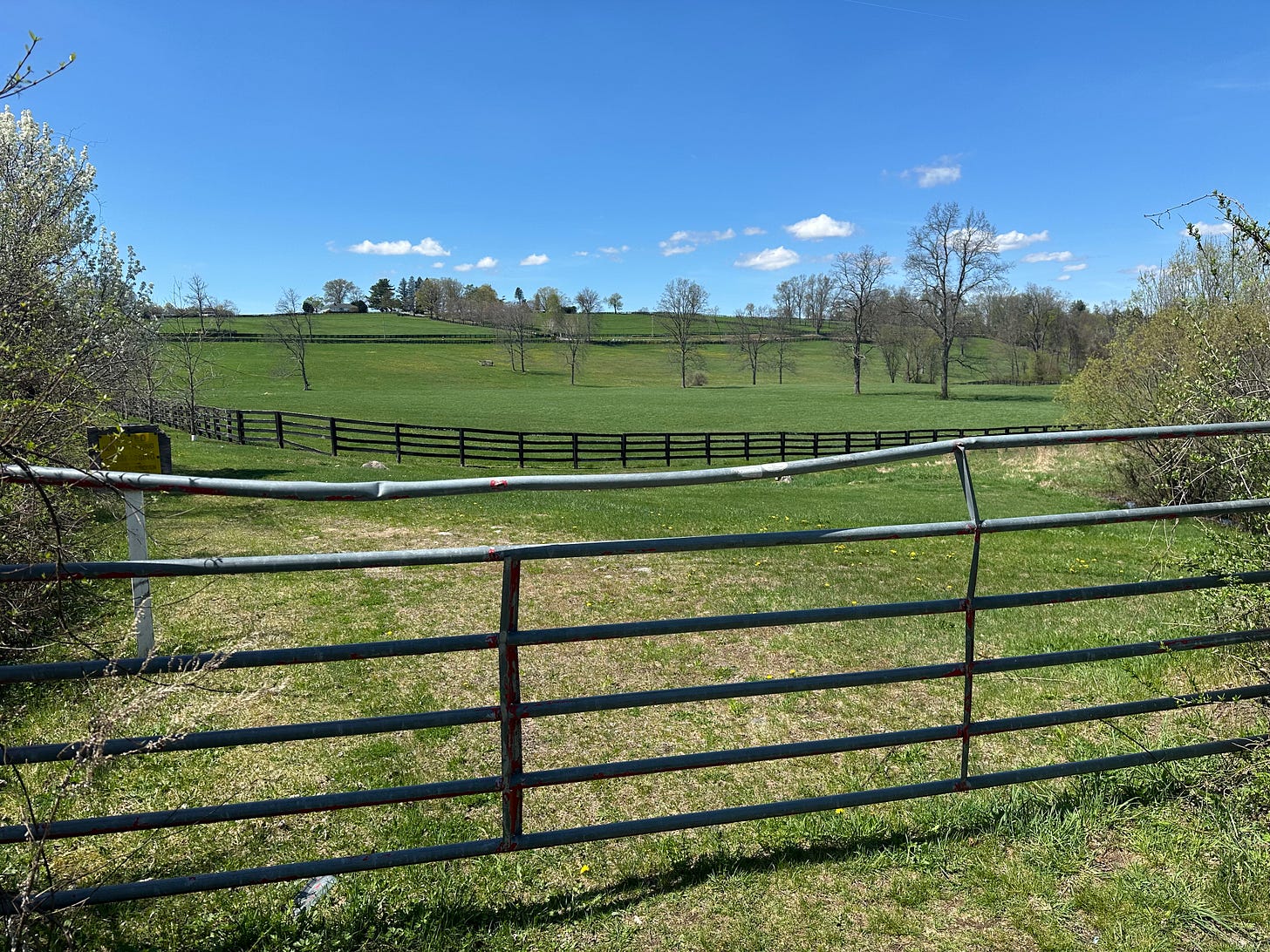 The violets were everywhere on the margins of the trail below the fence, small and purple and unbothered. The lesser celandine had taken over the verge entirely, yellow beyond yellow, a color that invades and insists on itself. A pond appeared through the trees, the water grey-blue and still. A rusted gate opened onto rolling fields so green in this still early Spring they looked invented rather than sown.