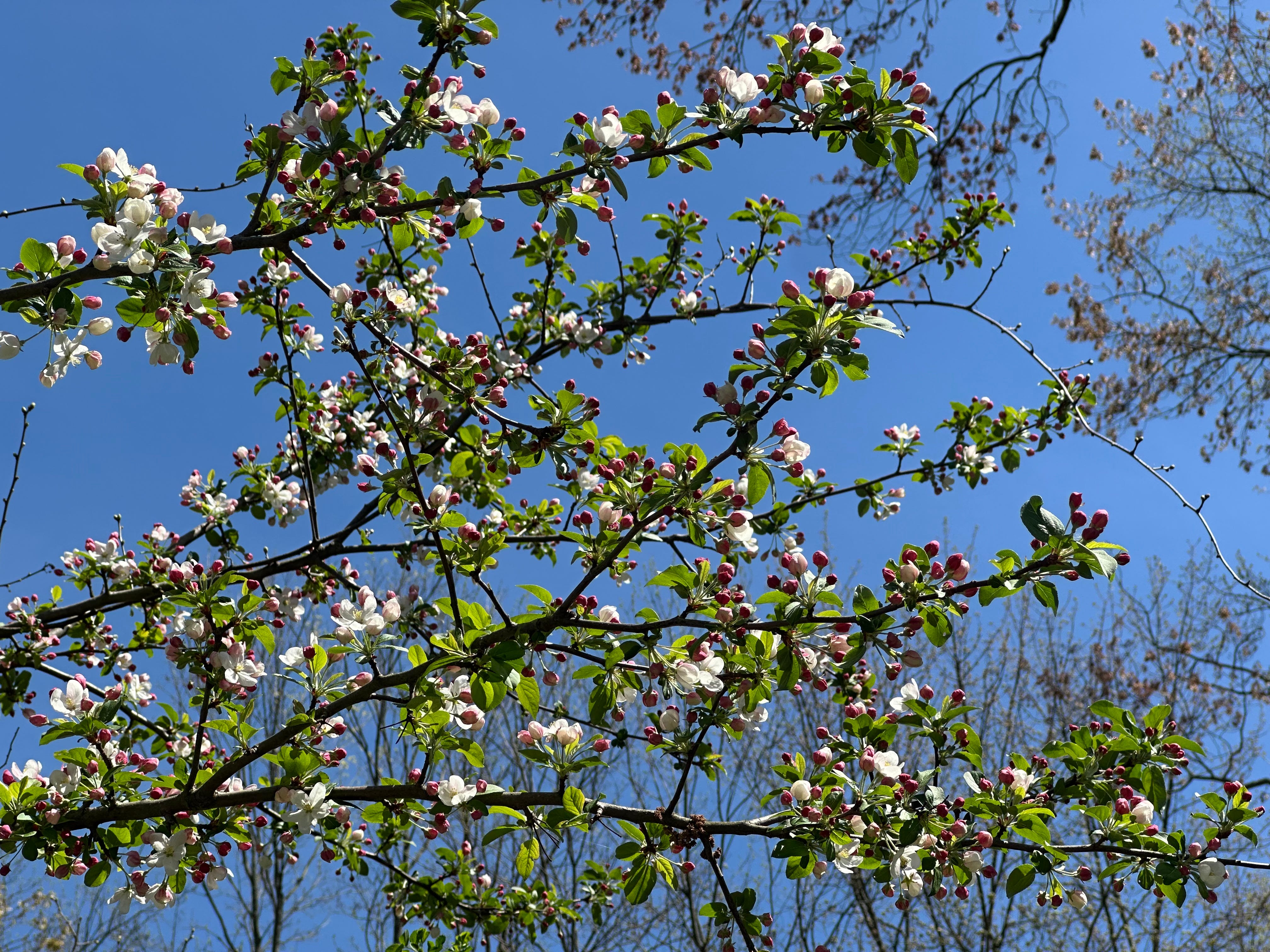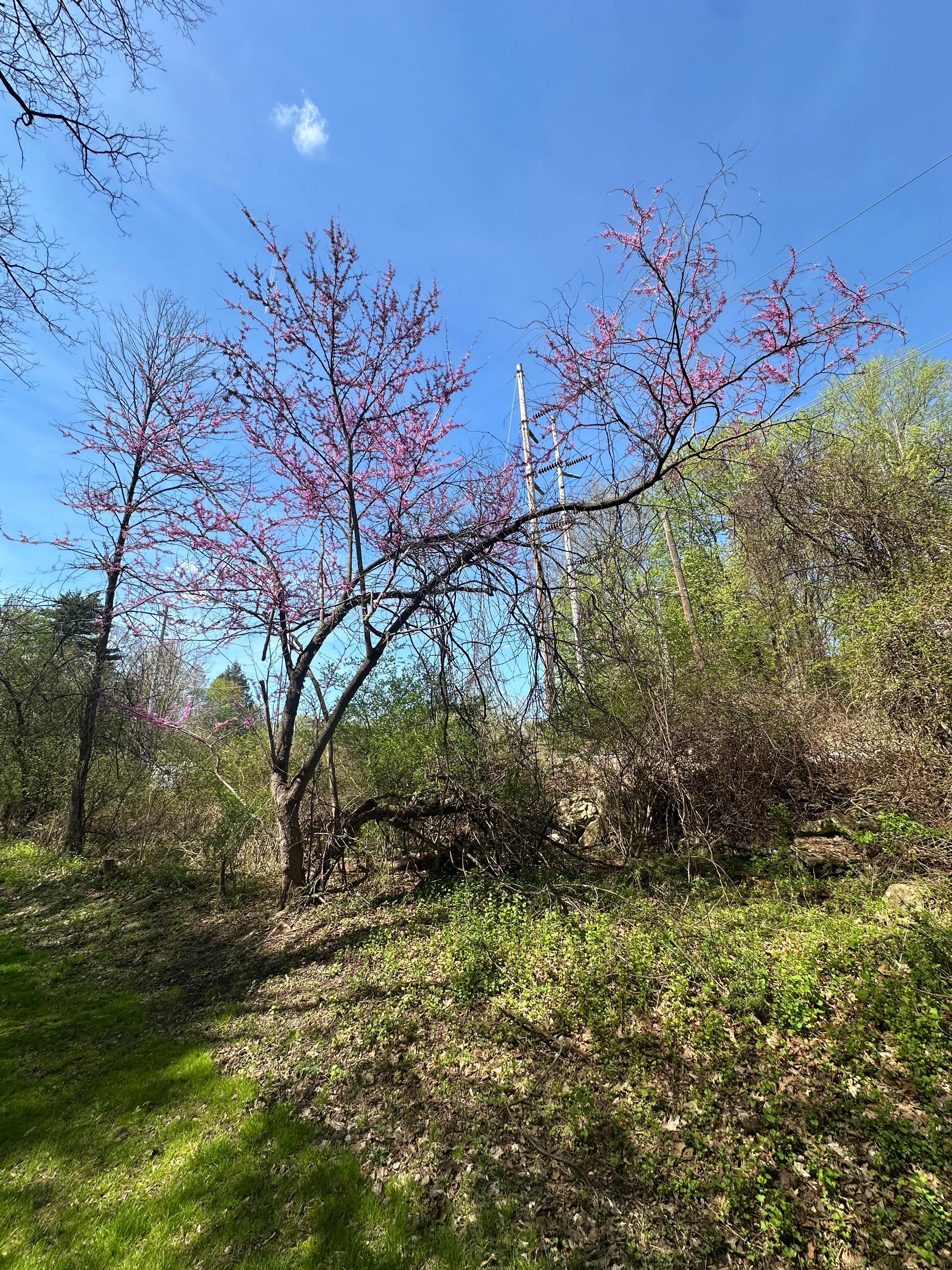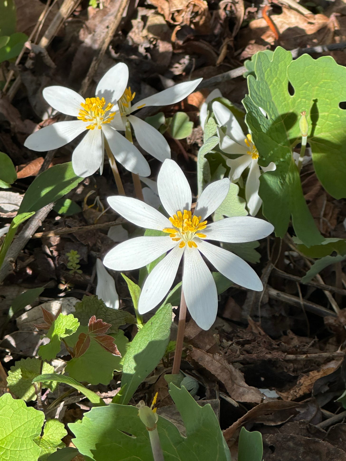 Today, spring was performing at full volume. The redbuds had gone full magenta against the blue sky. Crabapple branches held their buds like small fists of deep pink, each one about to open. And there, along the edge of the trail where the leaf litter meets the grass, I found bloodroot (Sanguinaria canadensis): three flowers in a cluster, each one an almost embarrassing white, with a crown of yellow at the center. Bloodroot blooms for two or three days. That’s it. The petals fall at the lightest touch, the faintest breath of wind. It doesn’t waste itself on longevity. It shows up entirely, and then it goes.